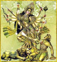 Tehdy démon Mahišásura vytvořil takový chaos, že tím narušil nejenom zemi, ale i nebesa. Božské bytosti, obávající se o svoji bezpečnost, požádali Umu o ochranu. Démon zaútočil na její tapovanam a rozpoutala se divoká bitva mezi jeho silami a bytostmi, které zde hledali útočiště. Obránci byli zatlačování zpět a tak Uma nakonec na sebe vzala svoji strašnou podobu Durgy se šestnácti zbraněmi a vyrazila proti démonovi. Boj mezi nimi byl dlouhý a divoký, ale nakonec Durga démona přišlápla k zemi a probodla svým trojzubcem. Pak uřízla jeho hlavu a tančila v radosti nad vítězstvím. Božské bytosti ji zasypaly květy a pěly chválu. Z nebes bylo slyšet božskou hudbu. Veškerý prostor se rozzářil.